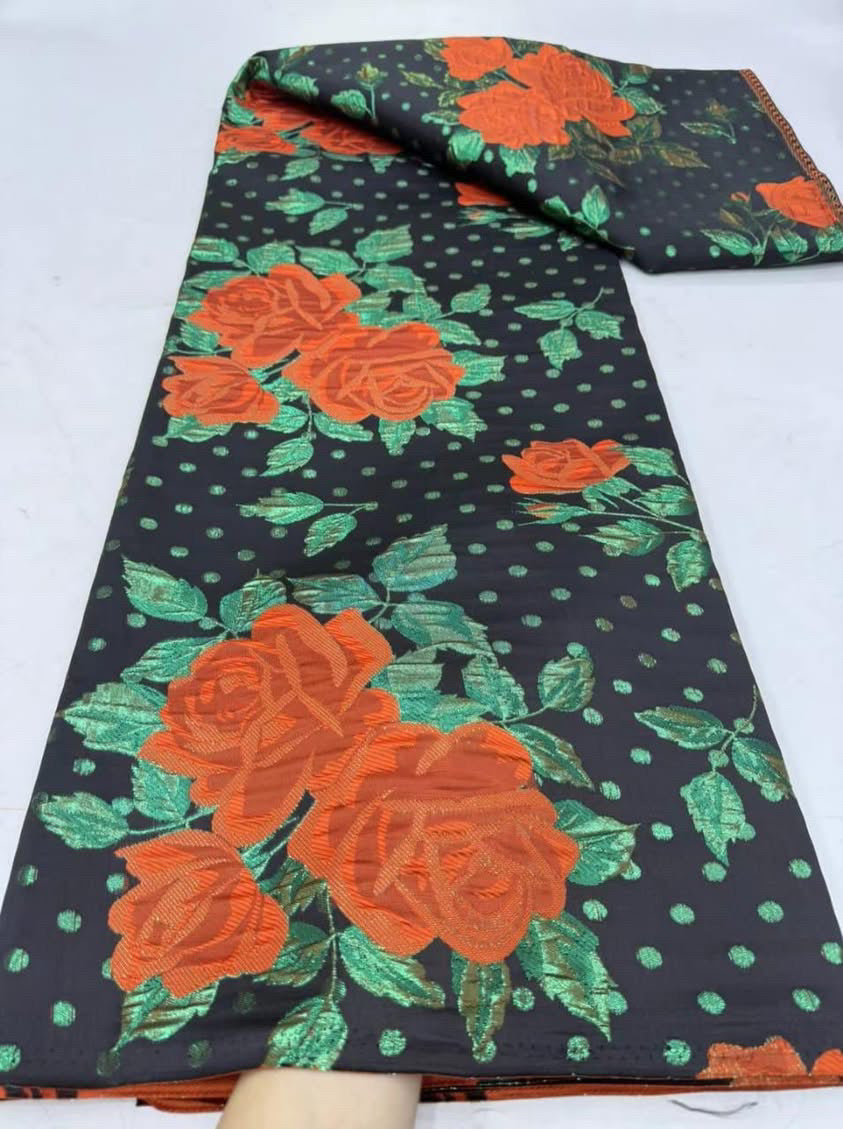 This fabric features a striking floral design, including bold roses with leaves and scattered polka dots. Its woven texture resembles brocade, making it ideal for garments, decorations, or upholstery.